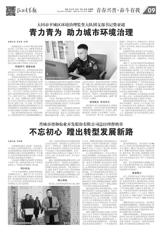 青年是时代舞台上永恒的主角,是社会发展的中坚力量,是国家和民族的未来和希望。在三晋大地这片古老而充满活力的土地上,2024年是见证无数山西青年为中国式现代化挺膺担当的一年。《山西青年报》的“青春兴晋·奋斗有我”专版犹如一个璀璨的舞台,以个体叙事和群像雕塑相结合、讲故事和谈观点相结合的方式,生动地展示了来自各行各业的312位青年典型人物的风采,树立了当代青年敢于有梦、勇于追梦、勤于圆梦的奋斗形象。他们如同312颗耀眼的星辰,在乡村振兴、创新创业、绿色发展、社会服务等各领域熠熠生辉。