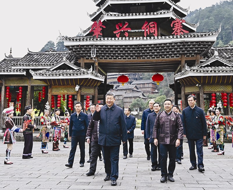从鼓楼起身,村民们纷纷簇拥过来,热烈鼓掌,高声向总书记问好。习近平高兴地回应说,侗族人民朴实、勤劳、有文化、有智慧,希望大家在中国式现代化进程中把乡村振兴搞得更好,祝愿大家的日子越过越红火。离开侗寨时,侗族群众深情地唱起 《侗歌声声唱给党》,表达对总书记的热爱和依依不舍。习近平频频挥手,同乡亲们道别。 (下转02版)