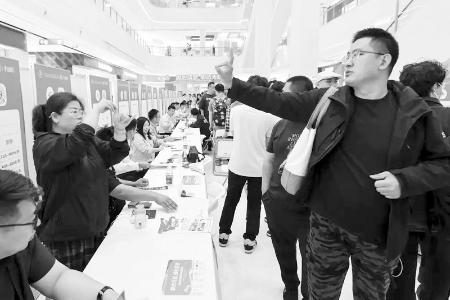 5月17日,在全国残疾人专场公益招聘会 (北京主会场)现场,一名应聘者(前右)用手语与招聘人员交流。