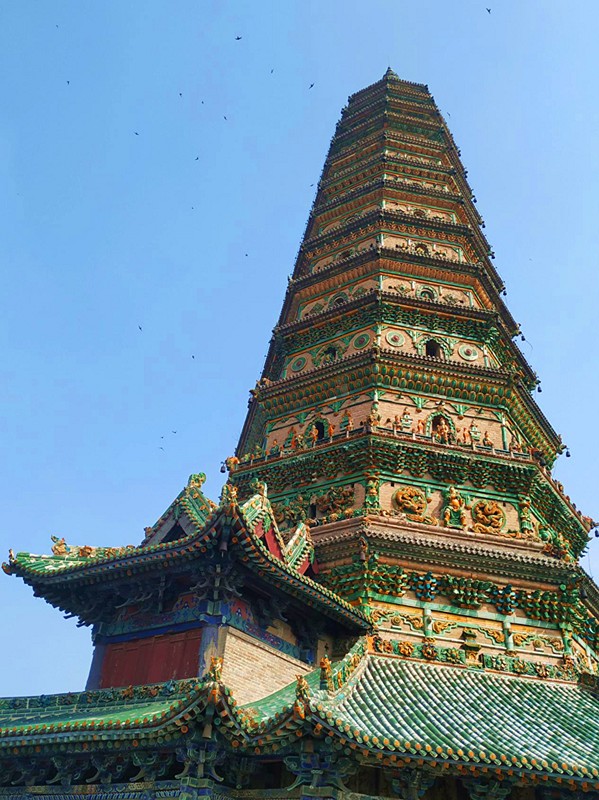 广天胜世,千年古刹;飞虹宝塔,举世无双。踏进广胜寺的山门,便能看到一座宏伟高大的七彩琉璃宝塔。塔身金壁辉煌,平面呈八角形,共十三级。外部用七彩琉璃装饰,一二层最为精致,斗拱、角柱、望柱、香莲柱、莲花、佛像、金刚、力士、花卉、鸟兽,形式多样。檐角均挂有风铎,塔顶有铁制法轮,中镶风磨铜塔刹。琉璃塔在阳光的照射下,犹如一道彩虹。