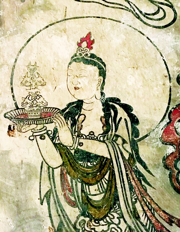 东墙的壁画上,还绘有两尊头戴火焰莲花纹宝冠的菩萨,或双手捧花篮,或面带微笑,形态优美,略呈“S”形造型,展现出了女性婀娜多姿的体态。佛像下方还绘有瞪着双眼的金刚,肌肉紧张,青筋暴露,长发矗立,塑造了雄健威武、无坚不摧的佛教金刚的生动形象。