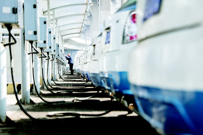 2月20日,太原市北中环高架桥下,众多新能源比亚迪出租车在此充电。据了解,为满足新能源车辆充电增多的需求,太原市政部门利用城市闲置空间合理开发建成多个智慧充电站,可同时满足多款新能源汽车进行快速充电,未来还将逐步开启阶梯电价等优惠政策,进一步助力城市“绿色出行”。 本报记者 胡远嘉 摄影报道