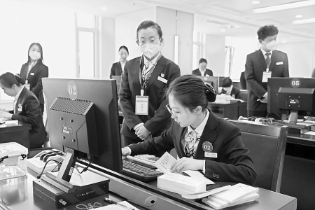 在柜面实操中,各个参赛选手整套操作都行云流水,裁判员们一丝不苟地在旁监督,选手们实力接近,差距仅在毫厘之间。