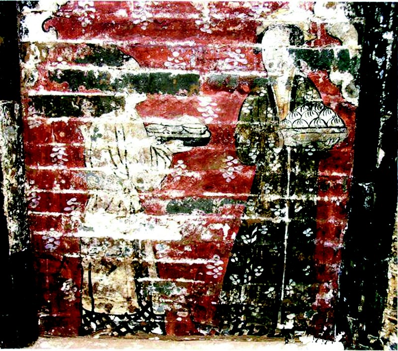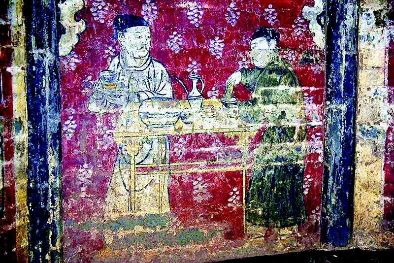 王氏墓葬的墓门是一扇半掩的门,门中一位雍容华贵的古代妇人微微探出头来,嘴角带有一抹微笑。原来,这是一幅色彩艳丽的壁画,其主人造型美艳生动,画匠们用巧妙的表现手法将人物与大门融为一体,其行为让人叹为观止。在墓室的北墙上,绘制了墓主人的全家福;西北壁上书“香积厨”,绘有两位厨娘端着热腾腾的包子和汤盘。东北壁上书“茶酒位”,绘有长桌、注壶、托盏等用具,两名男侍正在准备茶酒。墙壁上还绘有小猫、小狗在窗下玩耍的画面,极具生活气息。