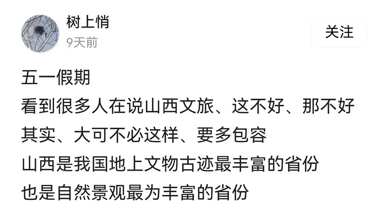 “这个五一,我在山西省晋城市走了很多地方,基本上都免费开放,这里的物价也不会太高,八九块钱就可以吃上一份饸饹面。周末的时候,晋城会有不少往来周边城市的免费班车,去往几十里路外的乡间公交也都仅仅一元钱。如果说哪个省的旅行最让我惊喜的话,那么山西一定可以算一个。”马且停在社交平台上这样说。
