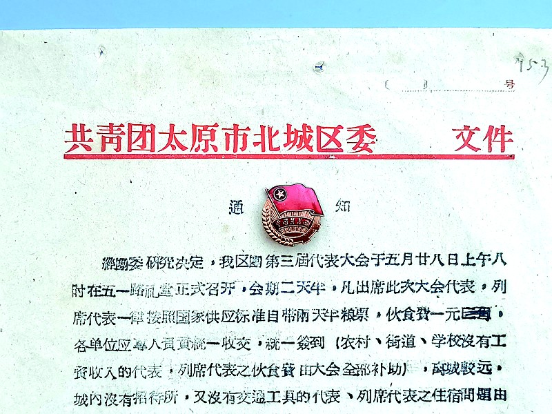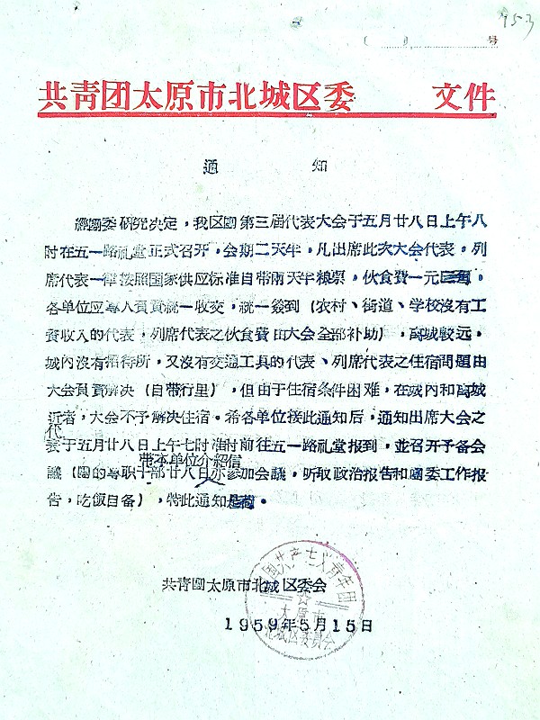 短短三百余字的通知,告知出席团代会的正式代表和列席代表,太原市北城区第三届团代会,将于1959年5月28日上午至30日上午召开,会期2天半,参会者一律按照国家供应标准,自带2天半粮票,伙食费1元。凡是来自农村、街道、学校无工资收入的,其伙食费由大会负责。凡是离城较远,城里没有招待所,又没有交通工具的,其住宿由大会负责,但必须自带行李,其他情况则一概不予解决住宿。