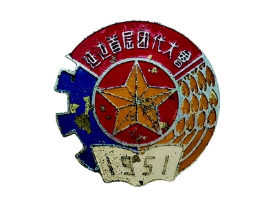 这枚饱经岁月沧桑的老徽章,留存至今已七十余载,它是1951年召开的延边地区首届团代会颁发的会议纪念章,颇为珍贵。其形制为圆形,正面呈微微向上隆起的弧形,胎体为铜质镀铬,烤漆工艺,红、黄、蓝、粉四色(因光线原因,下端的浅粉色在图片中显示为乳白色),宽度为23毫米,厚度为1毫米。可能是保存不善,章面多处脱漆,品相一般。