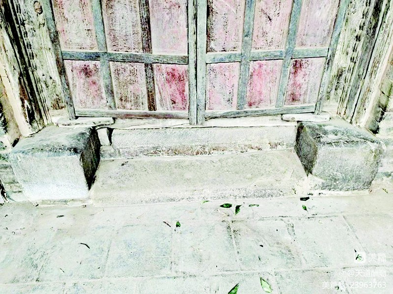 题记位于屋门左侧门墩石上。门墩石为石灰岩材质,门外露明部分光滑,上面刻有缠枝花卉与如意花边,在门墩石与地衔接处留有一条猫道,在道洞的位置,可以在门墩石上看到两行竖刻的小字:“大元国至元三十一年岁次甲午仲XXX姬宅置石匠天党郡冯XX冯XX。”尽管无法全部看清,但足以显示老宅的身份。