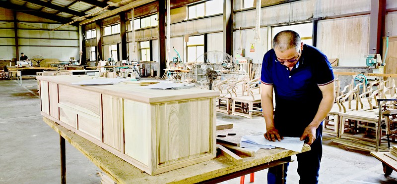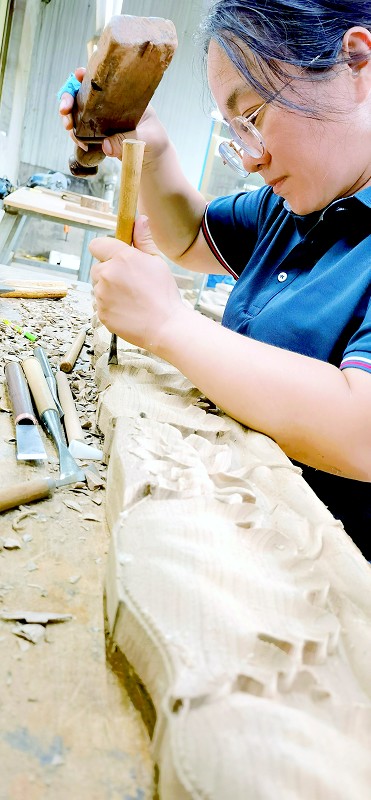 唐韵古典木业厂区内绿意盎然,木工车间、手雕车间、机雕车间、刮磨车间、油漆车间、组装车间分布其间,井然有序。匠人们全神贯注,祥云纹、回字纹、如意纹、卷草纹……每处雕花镂凿,都凝聚着匠心,展示着传承。