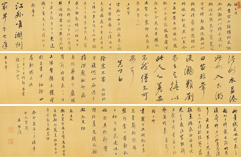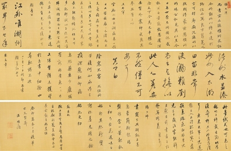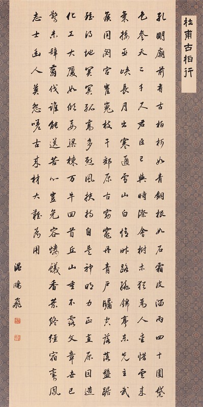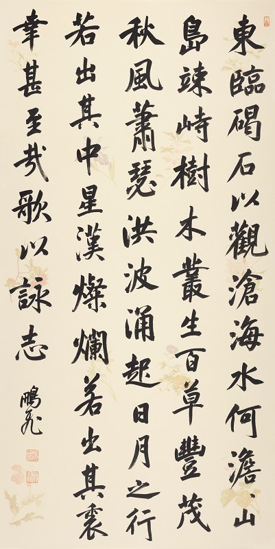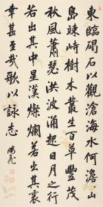 其二,鹏飞兄作书,对于“明清”的选择。鹏飞兄一直对于古代书法的展览与拍卖场中的古代书画场关注良多,常对我言:“明清是我们能接触到的最近的、能看到真品最多的时代,一个书者应当与真实的记录与真实的图像直接对话。”这是鹏飞兄对于“明清”选择最真切的看法,不能看到真正的作品、不能与真品零距离接触,对于书写来说也是一种极大困境。当下的书写本身就与日常书写拉开了极大距离,如果非要跳出作品最多的明清,那么将与真品拉开更大的距离。对于古代书法的追求,更多的应当是对于笔法的学习,我们能做到的仅仅是技术性层面的追求,面对这样的诉求,我们更应该关注真品最多的时代,对于“唐宋以后不足观”等等,回避明清书法的论调要保持一定的警惕与思考。对于我们现今关心明清的讨论中,关于“明清调”的问题讨论得较为广泛,鹏飞兄也在不断尝试着进入 “明清调”的各种形式,从大量关于形式问题的尝试中汲取营养,并不断尝试跳出“明清调”只是幅式的问题,而更加关注“明清调”中渗透的审美问题。在近年的书作中,他尝试着用“淡”之玄味与明清诸多形式进行融合,尝试着从明清的沃土中结出新的果实。鹏飞兄对于“明清”的选择,给出的判断与尝试是值得我们思量再三的。