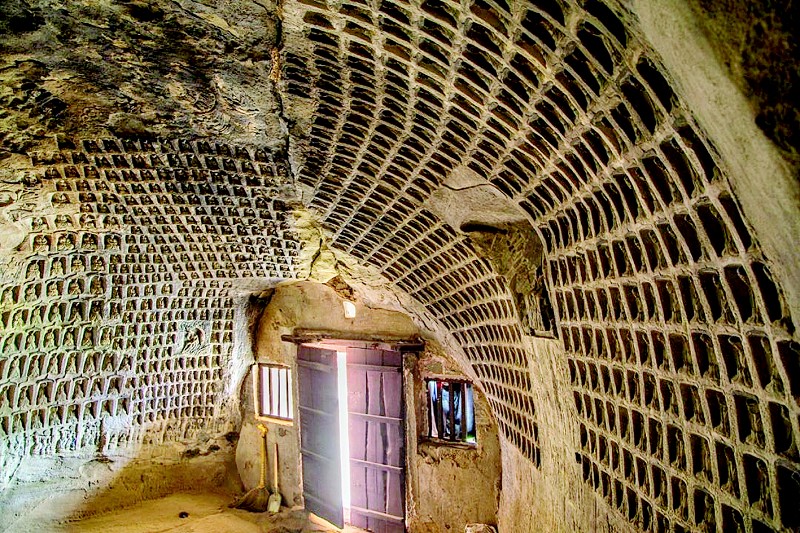 千佛洞为单间石窟,门框为4块雕刻而成的条石连接而成,后来加筑石块与青砖砌成拱形洞门。洞窟内空间不大,平面呈椭圆形状,石刻璀璨满目。