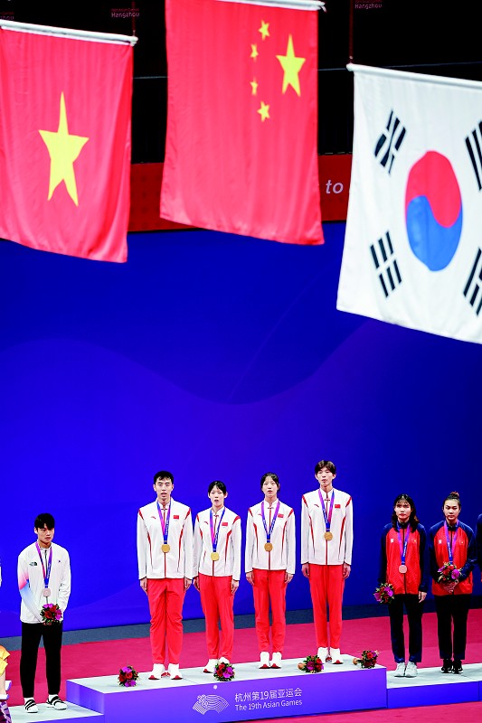 9月25日,杭州亚运会跆拳道多个项目的比赛在临安体育文化会展中心体育馆举行。由崔阳、宋兆祥、宋洁、周泽琪组成的中国队最终以84:77收获混合团体赛金牌。值得一提的是,周泽琪是山西太原姑娘,这也是本届杭州亚运会上山西运动员获得的首枚金牌。本版摄影 本报记者 胡远嘉08版