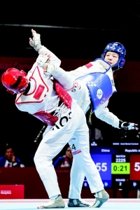 9月25日,杭州亚运会跆拳道多个项目的比赛在临安体育文化会展中心体育馆举行。当晚,跆拳道竞技混合团体赛决赛在中国队和韩国队之间展开巅峰对决。