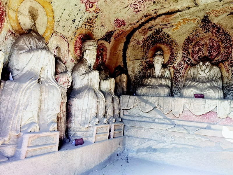 第一窟虚皇龛,共有雕像21尊,正壁主像为“虚皇”,为老子的化身,高居九清、司掌玄化、总御万灵。东西两壁为祖师神像,各有雕像10尊,脚下流云缠绕,窟顶雕刻盘龙,虽已风化,但元代石刻铭记依旧清楚。