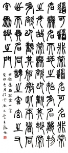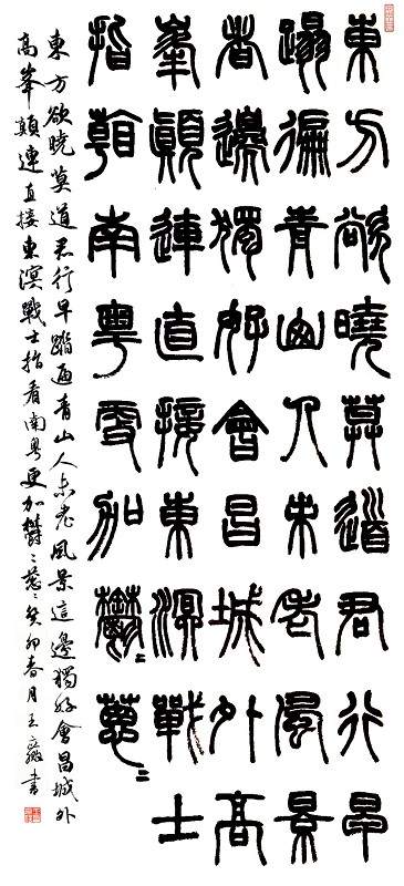 王赢兄书法修养比较全面,可谓 “一专多能”。“一专”者,是其篆书。常年来,他醉心于历代篆迹,含英咀华之间,已经化生出比较成熟的自我面貌。他以清篆面貌示人,气息淳古典雅,用笔取法邓石如,更能得二李篆书旨趣。之所以呈现出这种面貌,得益于他学书有法,师古而化。很多师友都知道,王赢曾大量临习清人篆书,在邓石如、吴让之等诸家书法上用功很深,对清篆“刚健含婀娜,端庄杂流丽”的美学特点理解深刻,也能够很好地将这些美学特点在自己的书写当中表达出来。而在平时的交流中,我知道他还曾经耗用大量时间和精力摩挲秦汉篆书,对泰山、峄山、琅琊等秦刻以及众多汉篆名迹都有过系统的研究学习。其清篆面目之中焕溢的淳古典雅之气,正是由此而来。众所周知,以清篆题榜殊为难事,难在清代篆书流动婀娜之姿态与题榜书典雅庄重之要求不易兼容。但我曾见其书“眠云卧石”“明月入怀”二篆书匾额,笔趣纵横的同时又能雍容肃穆,非于秦汉篆迹用功深厚者不能为之。
