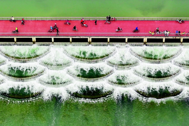 近日,太原汾河景区柴村桥段紧邻自行车道的“鱼鳞叠瀑”景观流水潺潺,瀑布流过错落有致的水台倾泻而下,犹如美丽的鳞片铺陈开来,构成了一幅独特的画卷,吸引了不少市民前往“打卡”。 据了解,“鱼鳞叠瀑”的设计灵感来源于南方农耕文化“龙脊梯田”和莲花造型,俯看犹如鱼跃龙门。该景观在满足水利工程壅水和消能的作用下,兼顾了河道汾水景观和公园交通,展现了水利设计的创新。 本报记者 胡远嘉 摄影报道