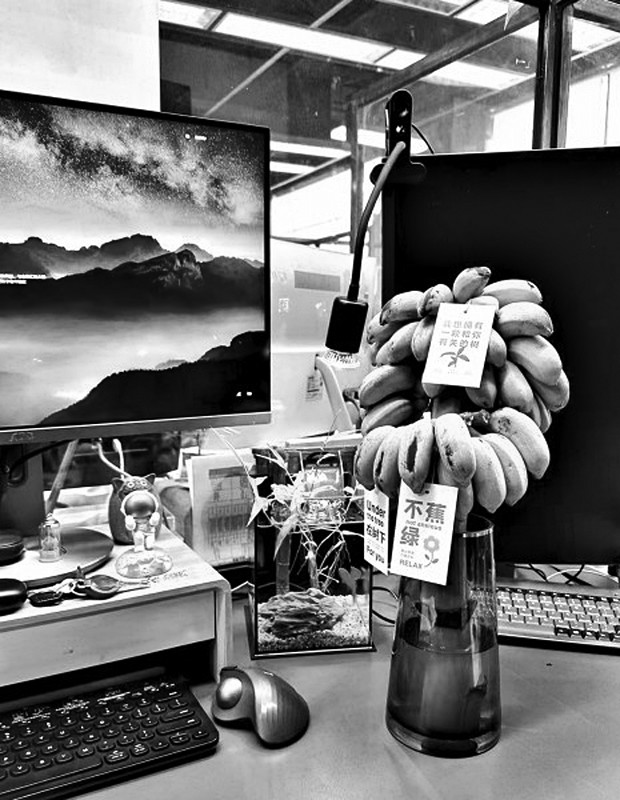 “没人试过把一大串香蕉带进公司养。很好玩,还可以带给同事惊喜,我所有同事都发现了,都笑到合不拢嘴。”吴圳说,自从他开始在办公桌上养香蕉之后,很多同事都会好奇地走过来瞧瞧。