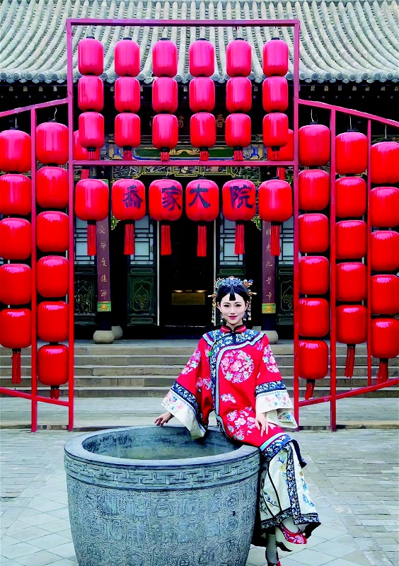 “快看!乔家少奶奶出门了。”几名穿着晋商特色服饰的女孩从祁县乔家大院走出,她们额前覆一绺短发,轻挽云髻,甜甜的笑容让大院充满着青春气息。来自西安的游客林婉之说,她和同伴挑选了红色和紫色的衣服,选择了出镜率最高的大院主人乔致庸的院子和电影 《大红灯笼高高挂》取景地为拍摄地。