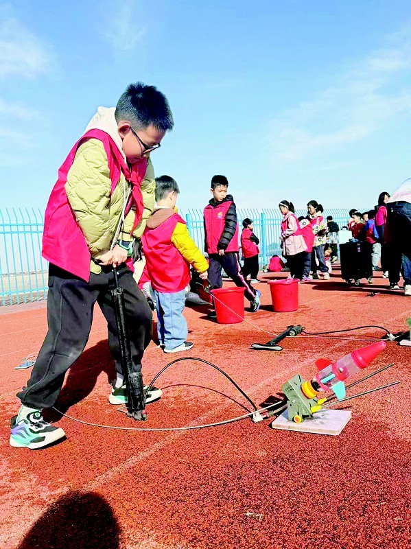 除了聆听引人入胜的航空故事,队员们在动手实践课程中更是大展身手。在航模制作环节,队员们小心翼翼地拼接零件,每一块木板、每一颗螺丝都承载着对飞翔的渴望;在水火箭发射现场,随着“嗖”的一声,自制的水火箭划破天际,留下一道道绚丽的轨迹,队员们欢呼雀跃、掌声雷动;在阻力伞体验环节,队员们亲身感受了空气动力学的魅力。