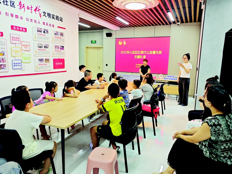 7月15日,在团太原市小店区委与万科城社区新时代文明实践站共同打造的社区红领巾公益暑期托管班上,一场别开生面的“牢记党的教导 争做强国少年”主题队课开讲。