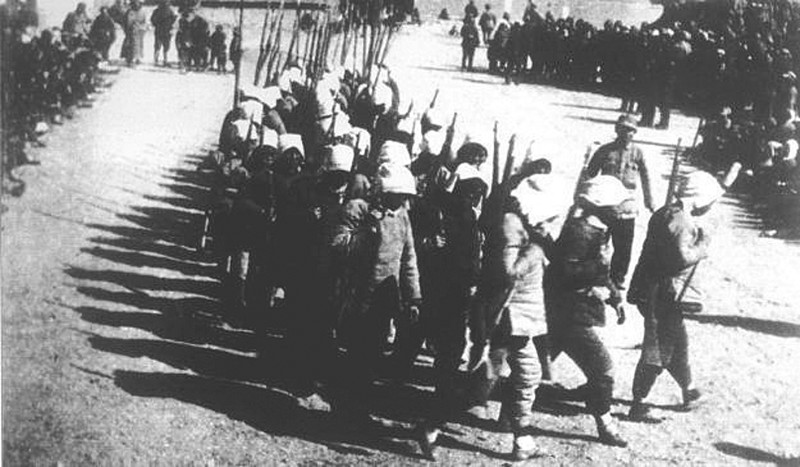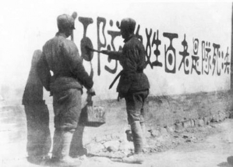 图2山西新军既是战斗队,又是工作队。他们走到哪里,宣传到哪里,动员青年参军;组织人民武装自卫队、游击队;协助地方建党、建政,组建工、农、青、妇等群众团体,创建抗日根据地。图为1938年初,决死队战士在沁县书写宣传标语。