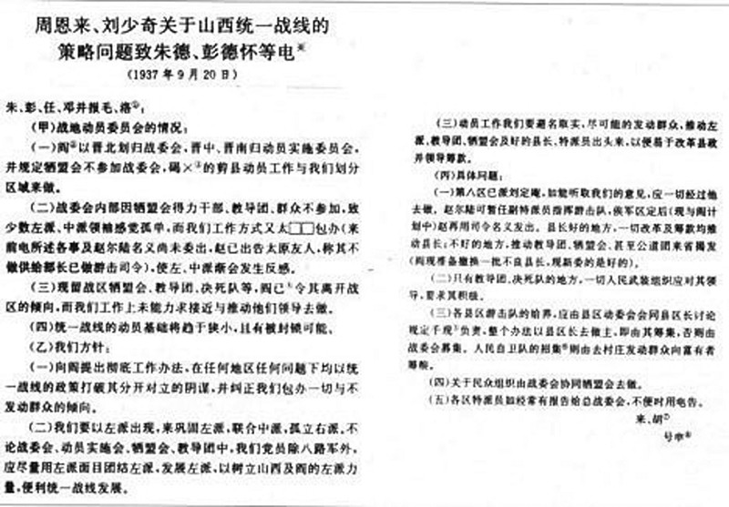 图11937年9月20日,周恩来、刘少奇关于山西统一战线的策略问题致朱德、彭德怀等电。