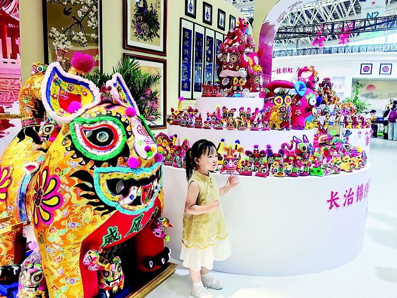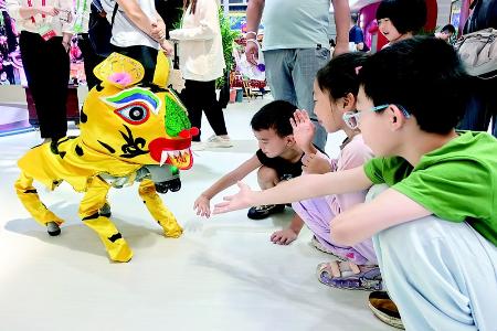 在长治展区,打扮成布老虎的机器狗吸引了孩子们的目光,纷纷上前一探科技奥秘。本届文博会,长治市将深厚历史底蕴与前沿科技深度融合,为传统文化注入新活力。堆锦、布老虎等非遗作品和充满“太行元素”的文创产品,立体呈现长治近年来文创发展的优秀成果。