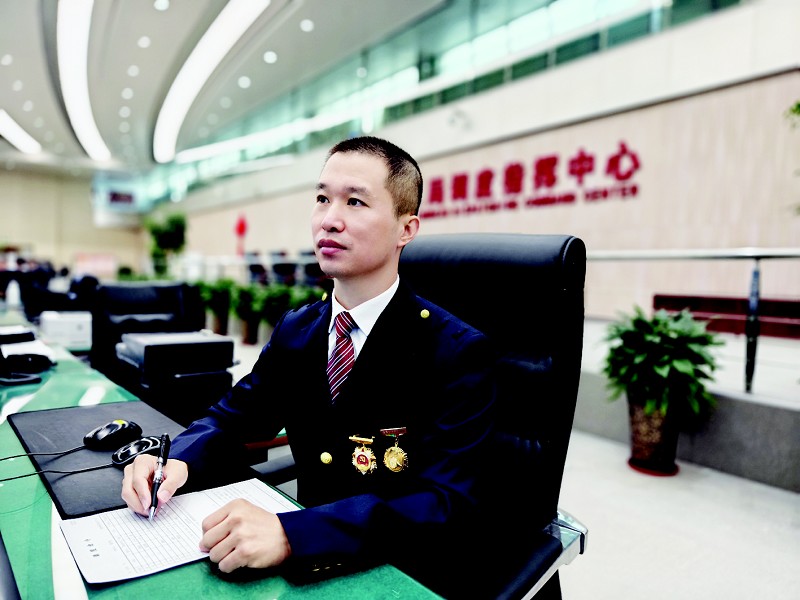 在调度台前,薛朝阳认真分析屏幕上不断跳动的列车运行数据,接打一个又一个电话。他告诫自己:有岗必有责,有责必担当。