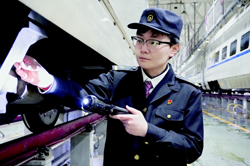 清晨5时30分,太原动车所检修库灯火通明,中国铁路太原局集团公司太原车辆段动车所女子乘务队队长杨静在CRH380A型动车组旁忙碌着,完成出车前的最后一次整备检查。