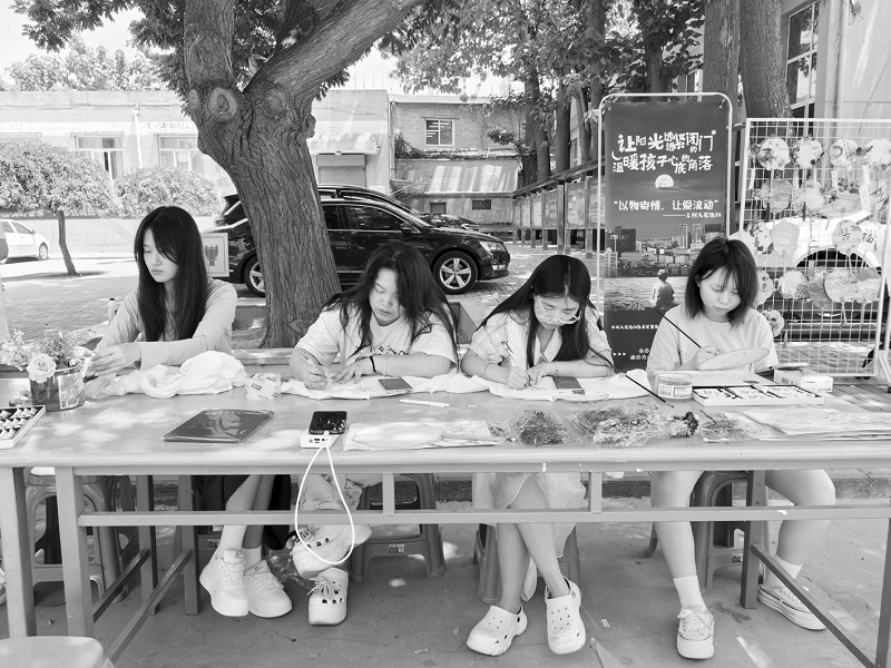 义卖活动现场,数字媒体专业的学生精心制作了文创产品。在植物拓印区,他们将新鲜的花草巧妙地拓印在布料上,每一个图案都承载着自然的美好;手绘T恤区,画笔在纯白的T恤上勾勒出五彩斑斓的世界,充满童趣与想象力;漆扇、团扇制作区,传统工艺与现代审美相结合,扇面上的图案精美绝伦;风铃制作区,一个个造型别致的风铃随风摇曳,发出清脆悦耳的声响……这些凝聚着青年学子心血的文创产品义卖所得善款将全部捐给太原市灵星社区服务中心。