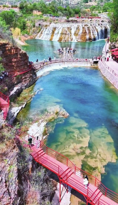 过了“连心桥”,乘观光电瓶车大约5分钟,便到了赤壁悬流大瀑布。河流从一处不规则的近半圆平台上四散流下,有一阶到底,有数阶入谷,有“万条垂下‘白’丝绦”之状,更有黄河壶口瀑布之势。游客或弯腰戏水,或聆听自然之音,人景融合,和谐入画。