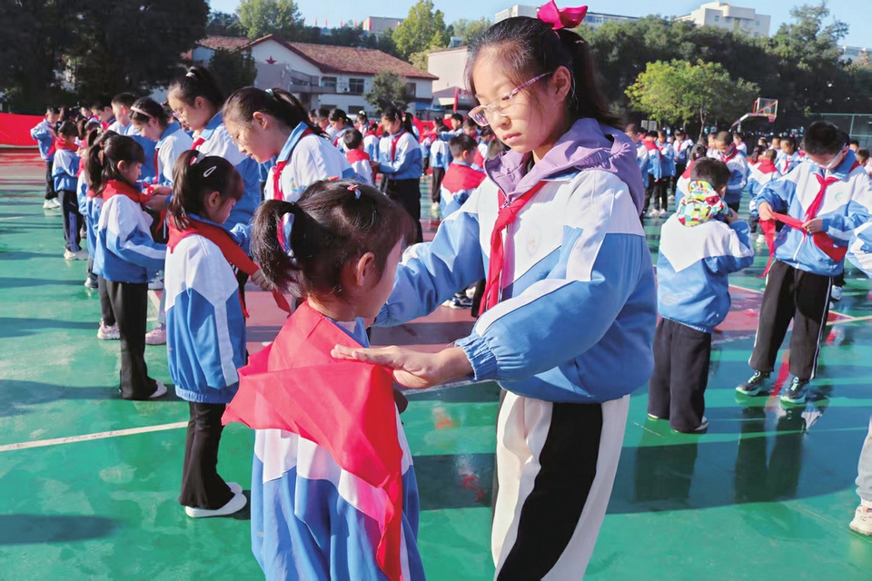 在《红领巾飘起来》的旋律中,老队员郑重地为新队员系上红领巾,新老队员互敬队礼,这一刻,红色基因在交接中得以延续。紧接着,全体新队员在大队委的带领下庄严宣誓,铿锵有力的誓言回荡在校园上空,成为新队员坚定理想信念的生动注脚。