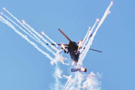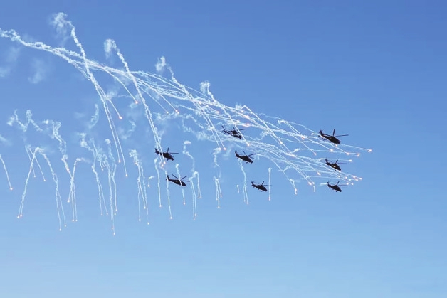 在开幕式的飞行表演环节,陆军“风雷”飞行表演队以七机“箭形”编队通场拉开飞行表演的帷幕,先后向观众演示了“双机对冲”“四机开花”等多个课目的特技飞行动作,展示了陆军航空兵部队转型建设和实战化训练成效。