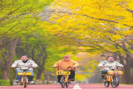 10月23日,太原市,数名青年骑行在汾河自行车道上,仿佛行进在金色画卷中。 据了解,每当进入深秋时节,位于滨河西路北中环桥路段的自行车道便会呈现“金色大道”景观,被广大骑行爱好者称为“醉美”自行车道。本报记者 胡远嘉 摄影报道