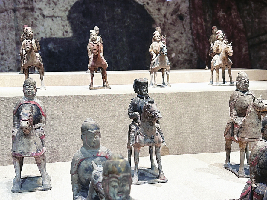 太原市博物馆内珍藏有一组陶俑阵,总是让观众眼前一亮。走进“并门雄镇军权重”展厅,多层台阶之上,武士俑、骑马俑、女官俑、侍女俑各自站立。放眼望去,仿佛一个地下军团正在苏醒。陶俑矩阵由娄叡墓、徐显秀墓、韩祖念墓、狄湛墓等北齐墓葬出土的陶俑组成,仪仗俑中可见骑兵俑,身下的战马嘴微张开、身姿挺拔,似有出行、征战之势。通过这组精巧细致、形神丰富的陶俑形象,观众可以走近北朝时期的丧葬文化,同时了解该时期的晋阳古城。