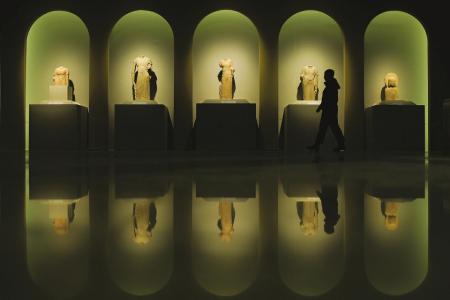 在“万象”单元中,石刻以佛教为核心,巧妙融入百戏杂耍、建筑形制等生活艺术元素,佛传故事与世俗图景交相辉映,全方位还原了当时的社会风貌;“更新”单元清晰呈现了造像风格的时代更迭,从北魏“秀骨清像”的神性庄严到北齐“薄衣贴体”的独特质感,再到唐代“丰腴健美”的温婉世俗,复刻了500余年佛教造像的审美渐变;“汇流”单元则立足山西作为多民族文化交融走廊的地理特质,梳理南涅水石刻在区域佛教艺术传播中的独特地位,印证了其作为佛教艺术中国化重要见证的核心价值。