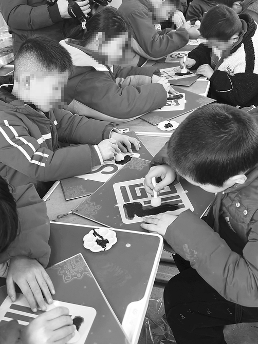 捐赠仪式后,拓印手作体验成为孩子们最期待的环节。拿起海绵拓印工具,蘸上墨汁,小心翼翼地在纸上按压,“平安”“福”等带着墨香的年味字样渐渐成型。孩子们互相展示着自己的作品,欢声笑语洒满校园。