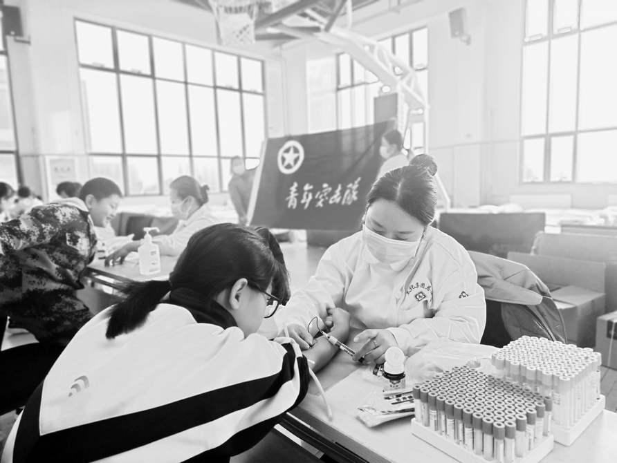“宝贝,快看,有小贴画哦!”采血台前,面对紧张哭泣的低年级学生,青年突击队队员蹲下身,举着卡通贴纸轻声安抚,娴熟地快速完成采血。