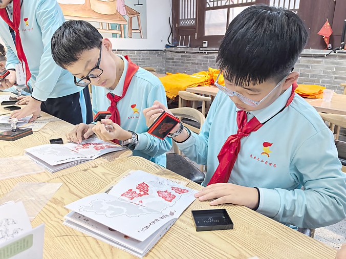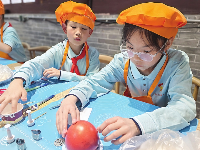 下午,队员们的足迹转移至太原古县城。在非遗工坊里,面团在队员们手中揉搓、捏塑、剪花,变成一个个色彩鲜艳的花馍。“我姥姥平时只做白馒头,最多加几颗枣。”10岁的刘力硕来自灵丘县城镇第七小学,他闻了闻自己做的彩色花馍,“有香味!”看到那么多精美的花馍作品,既感到震撼,也体会到了姥姥做面食的辛苦。