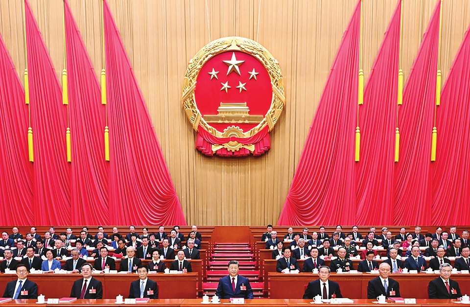 习近平、李强、王沪宁、蔡奇、丁薛祥、李希、韩正和大会主席团成员在主席台就座。