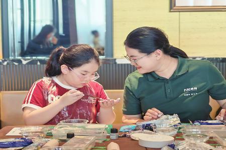 理论讲解后,备受期待的非遗体验环节开启。在专业老师指导下,孩子们化身小小工匠,拓包起落,墨色晕染,拓印纹样逐渐清晰;揉泥、制作、雕刻、上色,原本普通的素泥坯在孩子们手中蜕变为精美的仿琉璃瓦当。大家沉浸其中,真切感受传统工艺的精妙,实现了从“听文化”到“触摸文化”“体验文化”的转变。